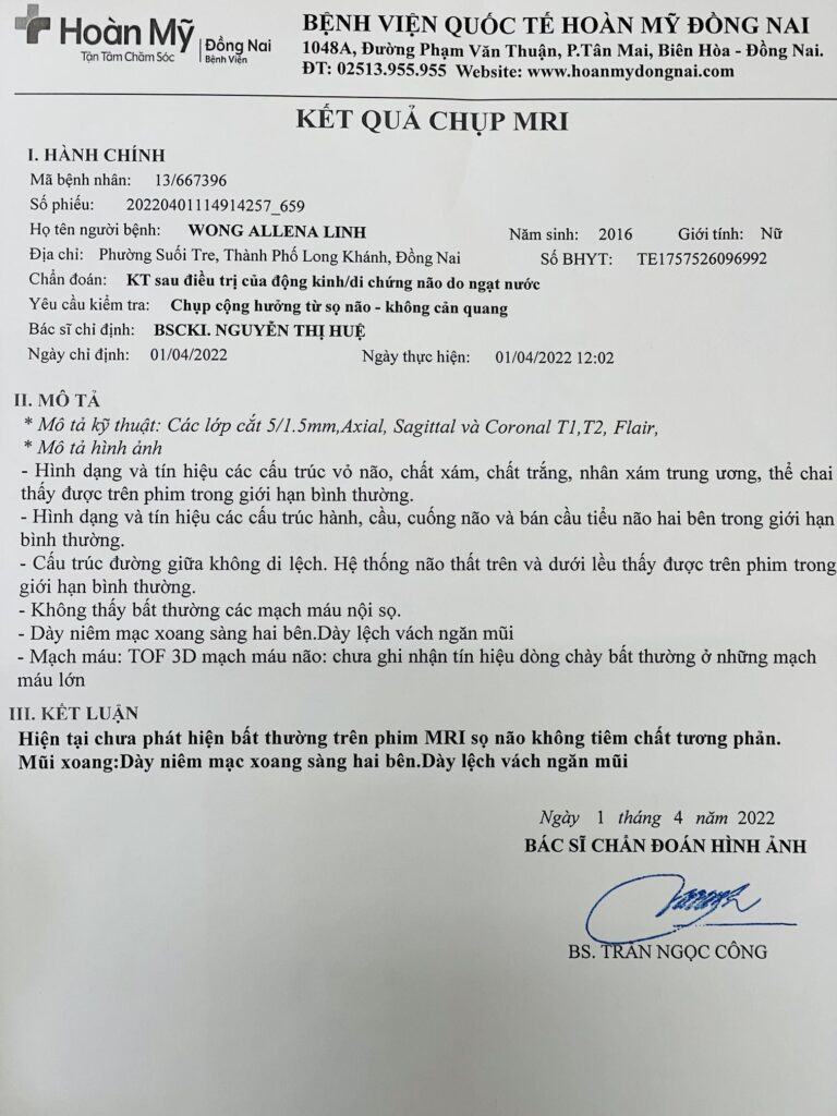 Sau một tháng dần hồi phục, đến ngày hẹn tái khám, gia đình chị đưa bé đi chụp MRI não. Khi đọc kết quả, bác sĩ đã thốt lên: “Ôi ca này là trời Phật thương nó, chứ khoa học không thể giải thích nổi.” Kết quả cho thấy, không có tế bào nào trong não có vấn đề. 100% não bé bình thường.