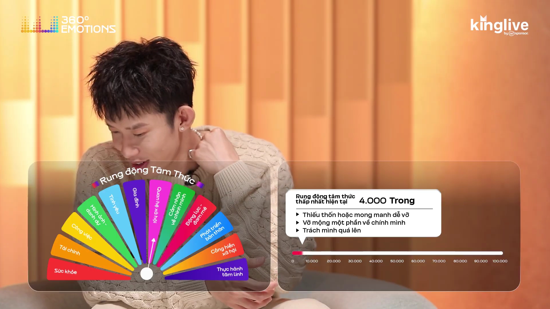 Người mang trong mình áp lực này, khi mọi việc không được như kỳ vọng hoặc khi gặp biến cố thì sẽ dễ rơi vào trạng thái tiêu cực là trách móc chính mình. Do đó, Kay có rung động tâm thức thấp nhất là 4.000 Trong – chỉ số thể hiện sự thiếu thốn, vỡ mộng & trách móc bản thân vì những sai lầm đã qua. Chính bản thân Kay cũng thừa nhận cảm xúc đó là một chiếc hộp bí mật mà Kay đã giữ cho riêng mình.