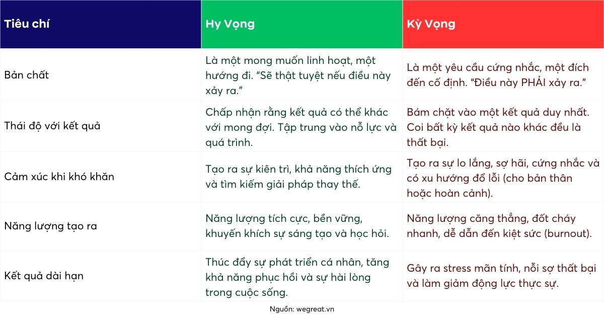 Nhìn vào bảng so sánh, chúng ta có thể thấy rõ một sự thật quan trọng: cả hy vọng và kỳ vọng đều khởi nguồn từ một mong muốn tốt đẹp về tương lai. Tuy nhiên, chúng tạo ra hai hành trình và dẫn đến hai trải nghiệm cảm xúc hoàn toàn trái ngược nhau, không chỉ trong quá trình mà còn tại đích đến.